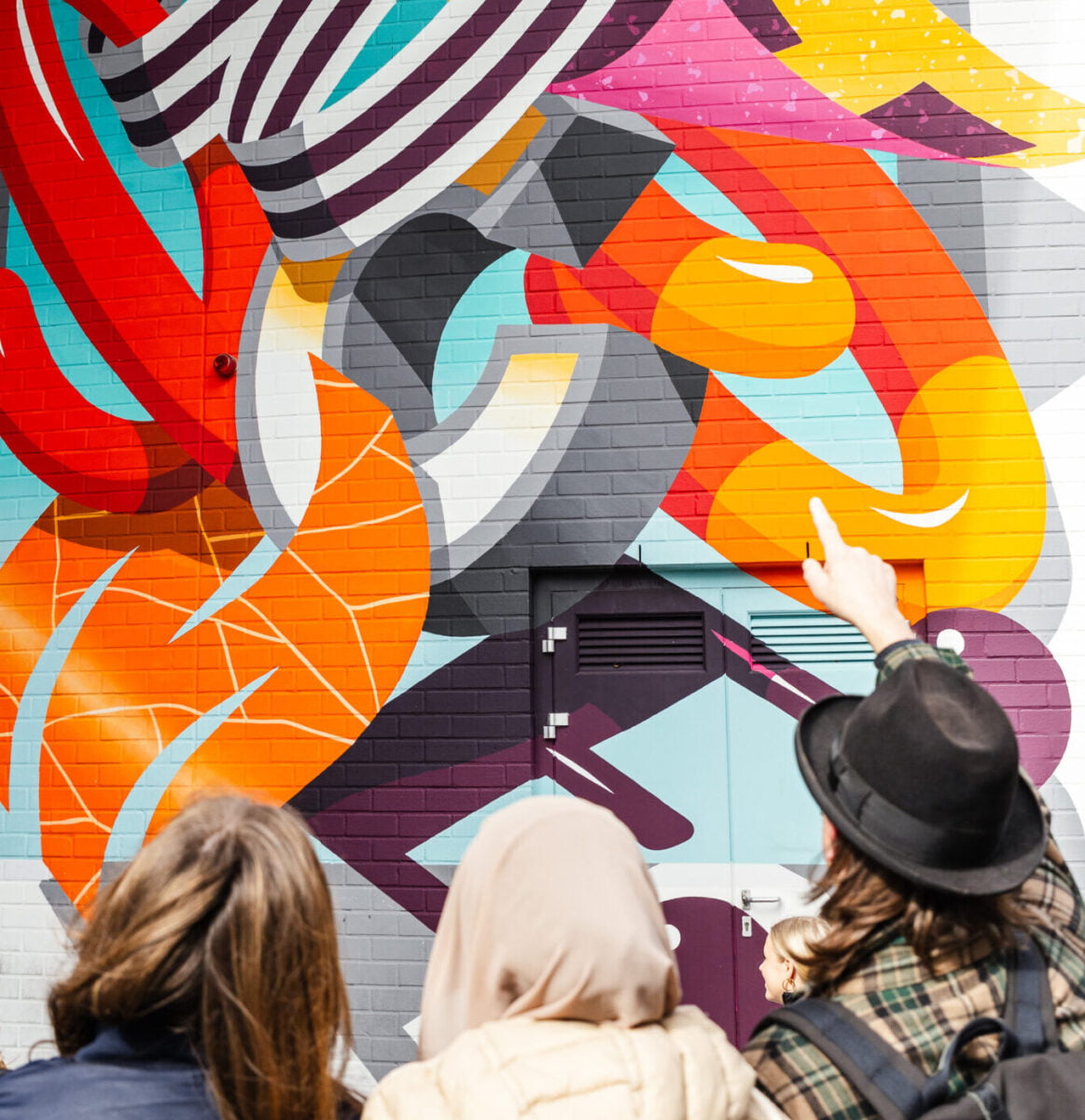 Tijdens de rondleiding vertellen we over de werkwijze van Blind Walls Gallery en verschillende kunstenaars. We laten het verschil tussen graffiti en street art zien en nemen leerlingen mee in de (historische) verhalen achter de schilderingen. Er worden veel (menings)vragen gesteld en de studenten onderzoeken in groepjes een vraag. Zodoende leren ze over de kunstvorm ‘murals’, maar ook over cultureel erfgoed en het belang van kunst in de openbare ruimte.