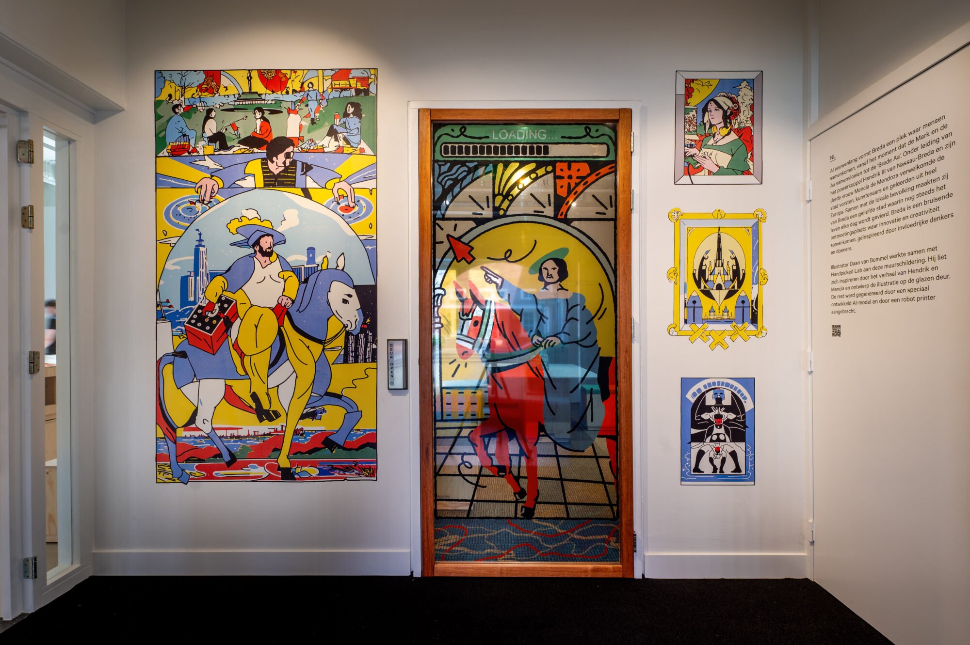 Illustrator Daan van Bommel collaborated with Handpicked Lab and was inspired by the story of Hendrik and Mencia. The design on the door was created by Daan himself. The other illustrations were generated by a specially developed Al model and applied by and robotic printer.