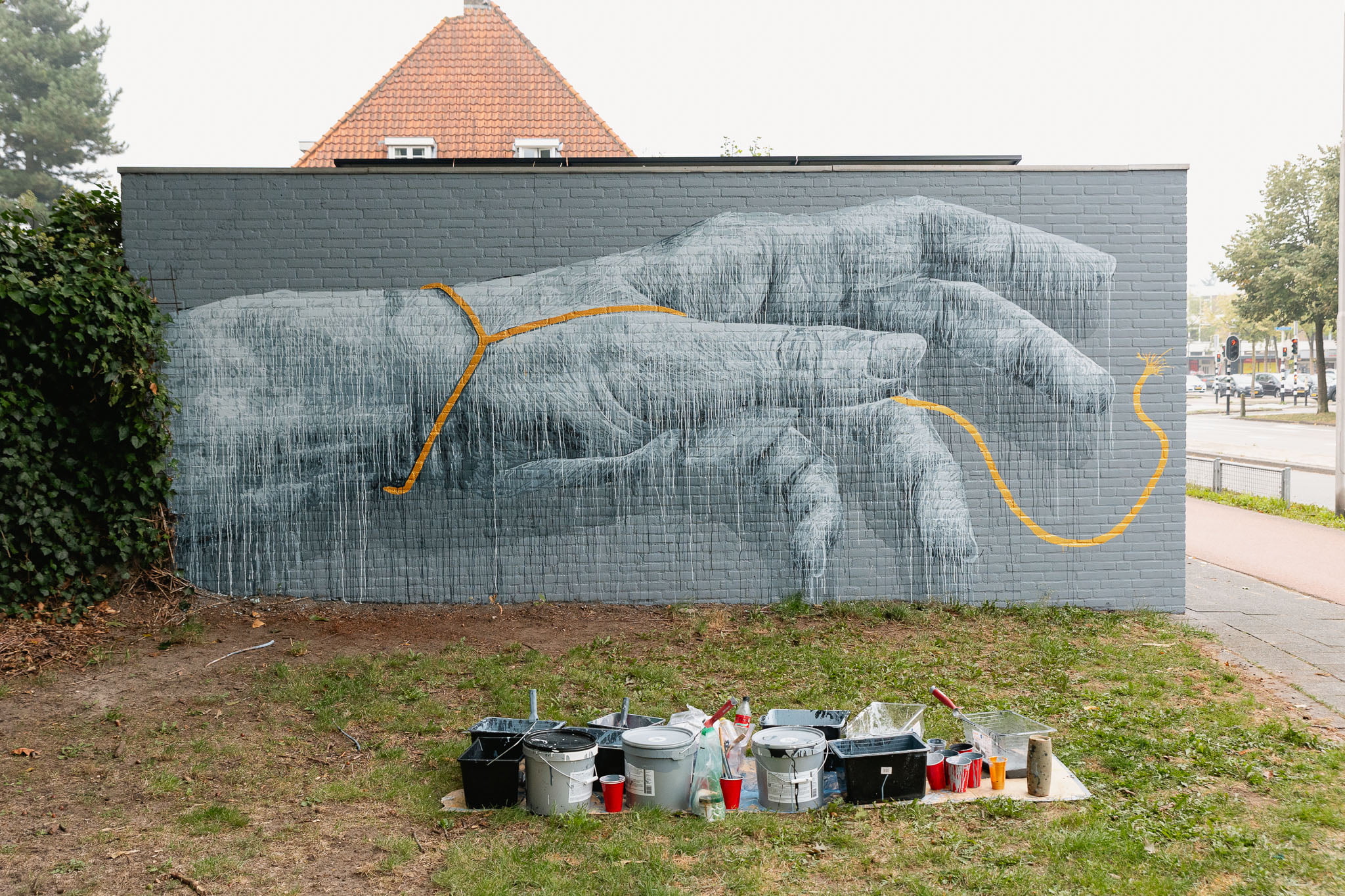 Nils has had many conversations with the group involved supported the arrival of this Blind Wall. Those conversations inspired him to create a work of art that reflects this painful past. The common denominator in the personal stories was the moment of separation between mother and child. This is symbolized in the mural by a broken golden cord and two hands: one of the mother and one of the child, both with a cord around their wrist that breaks at the corner of the facade. By placing the hands separately on different sides of the wall, the stories can also be viewed separately, as all stories of those involved are unique.