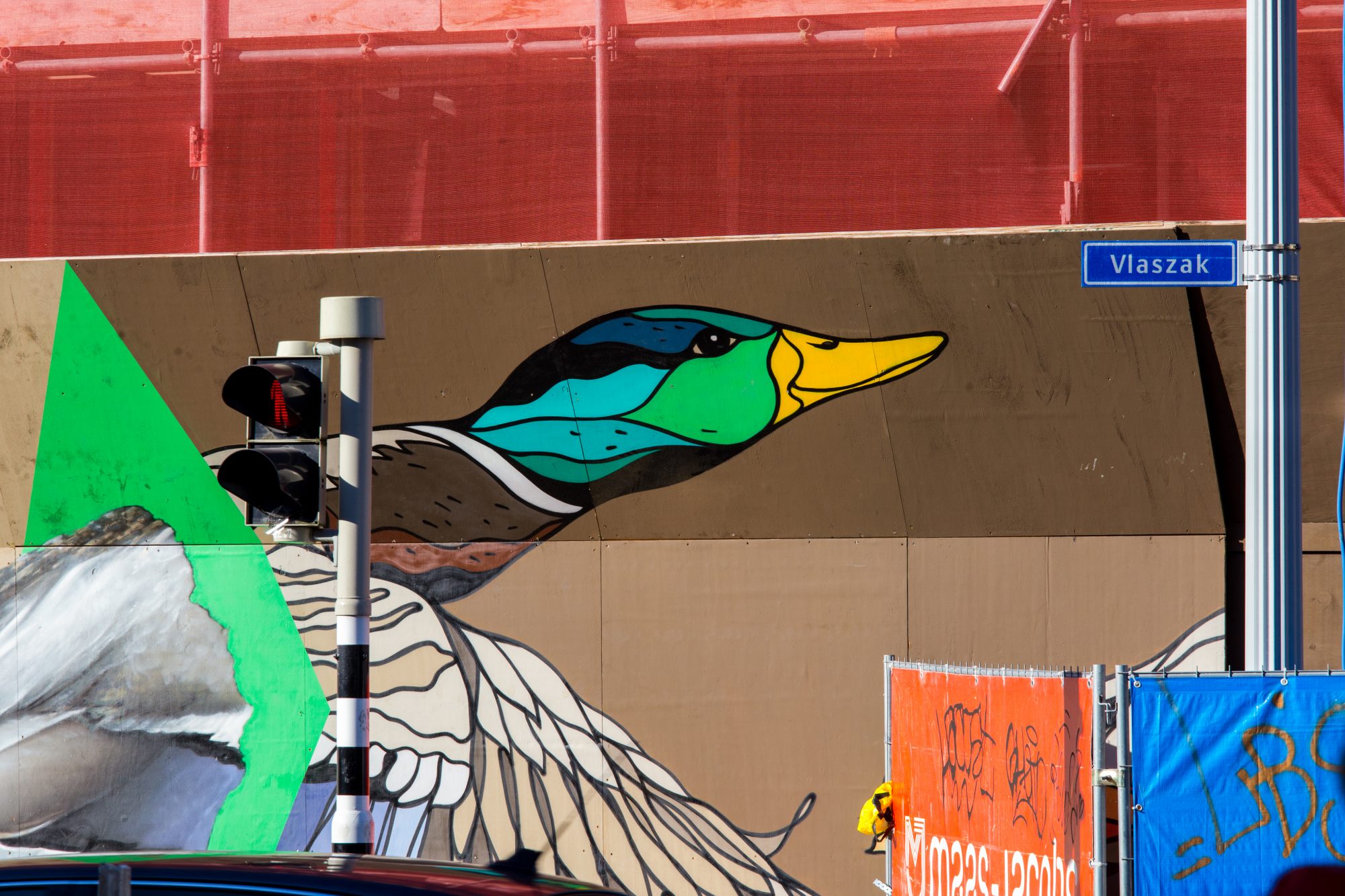 This painting on a temporary construction wall shows a flight of ducks for which fotorealism and illustration are combined.