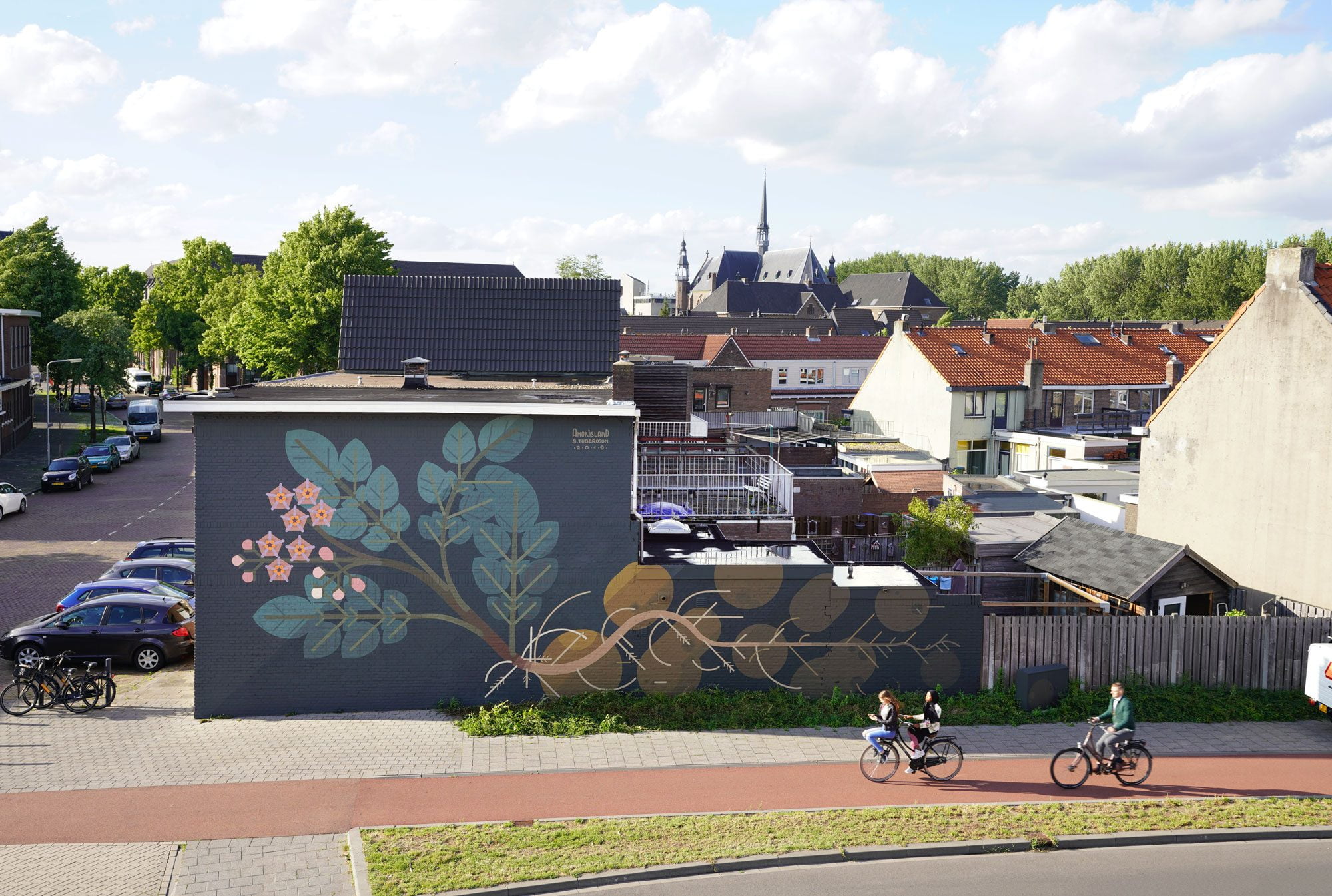 Zo gezegd, zo gedaan. In de schildering is duidelijk een aardappelplant te zien, de inspiratie daarvoor komt van de nabij gelegen Gasthuisvelden, én de naam van de straat waar de schildering is aangebracht, de Vincent van Goghstraat. De Gasthuisvelden zijn vernoemd naar het ooit nabij gelegen Katholieke Gasthuis aan de Haagdijk, waar ‘behoeftige zieken’ en ‘oude van dagen’ werden verzorgd. De omliggende velden werden gebruikt als moestuin en akkers waar ook, je raadt het al, aardappelplanten groeiden.