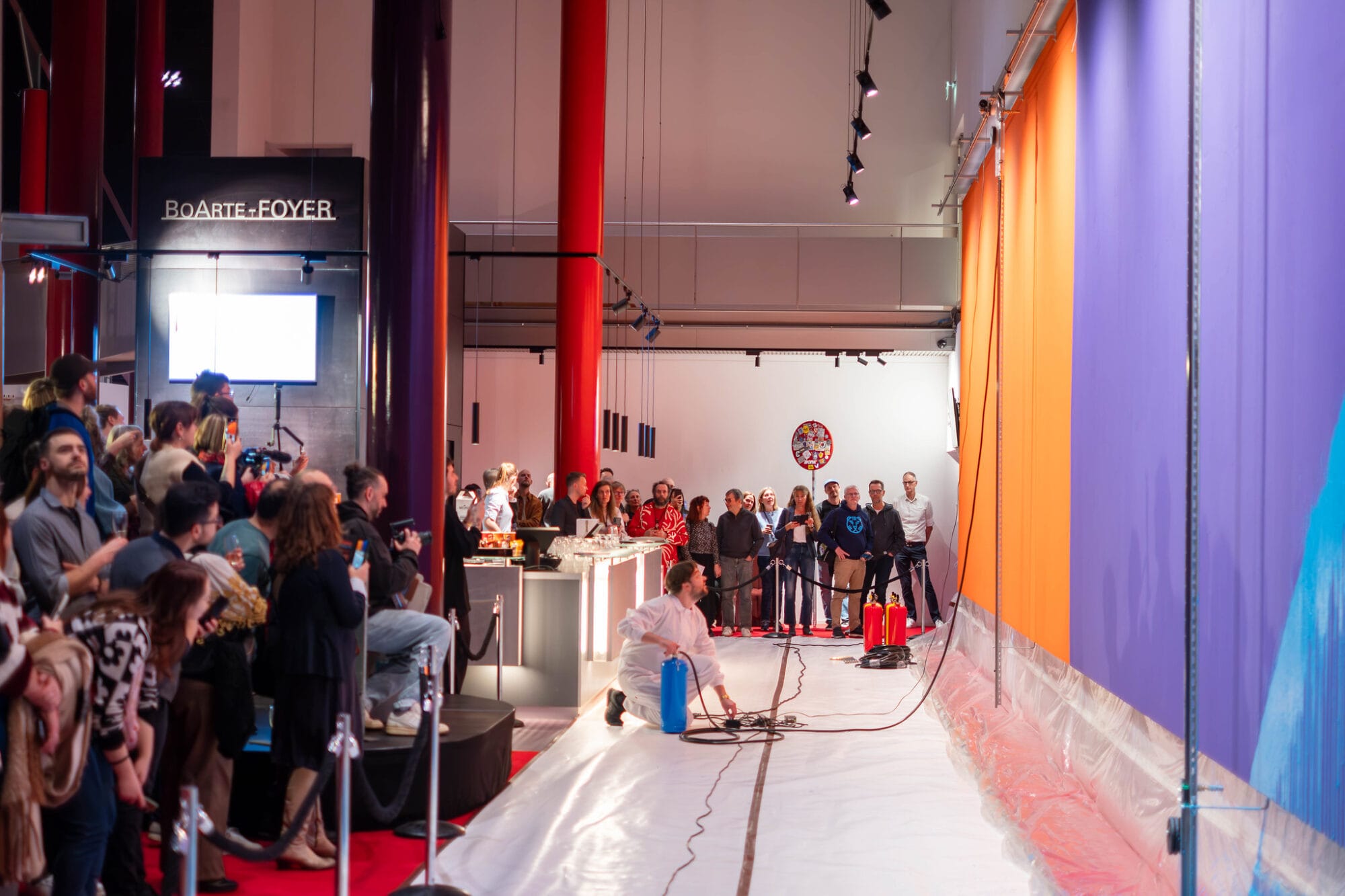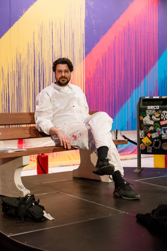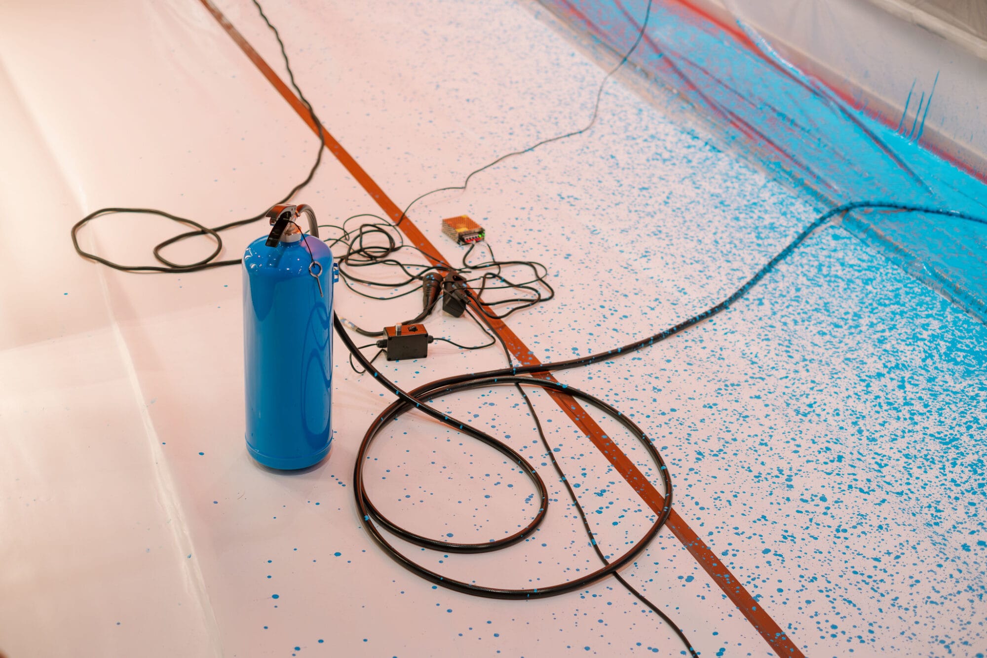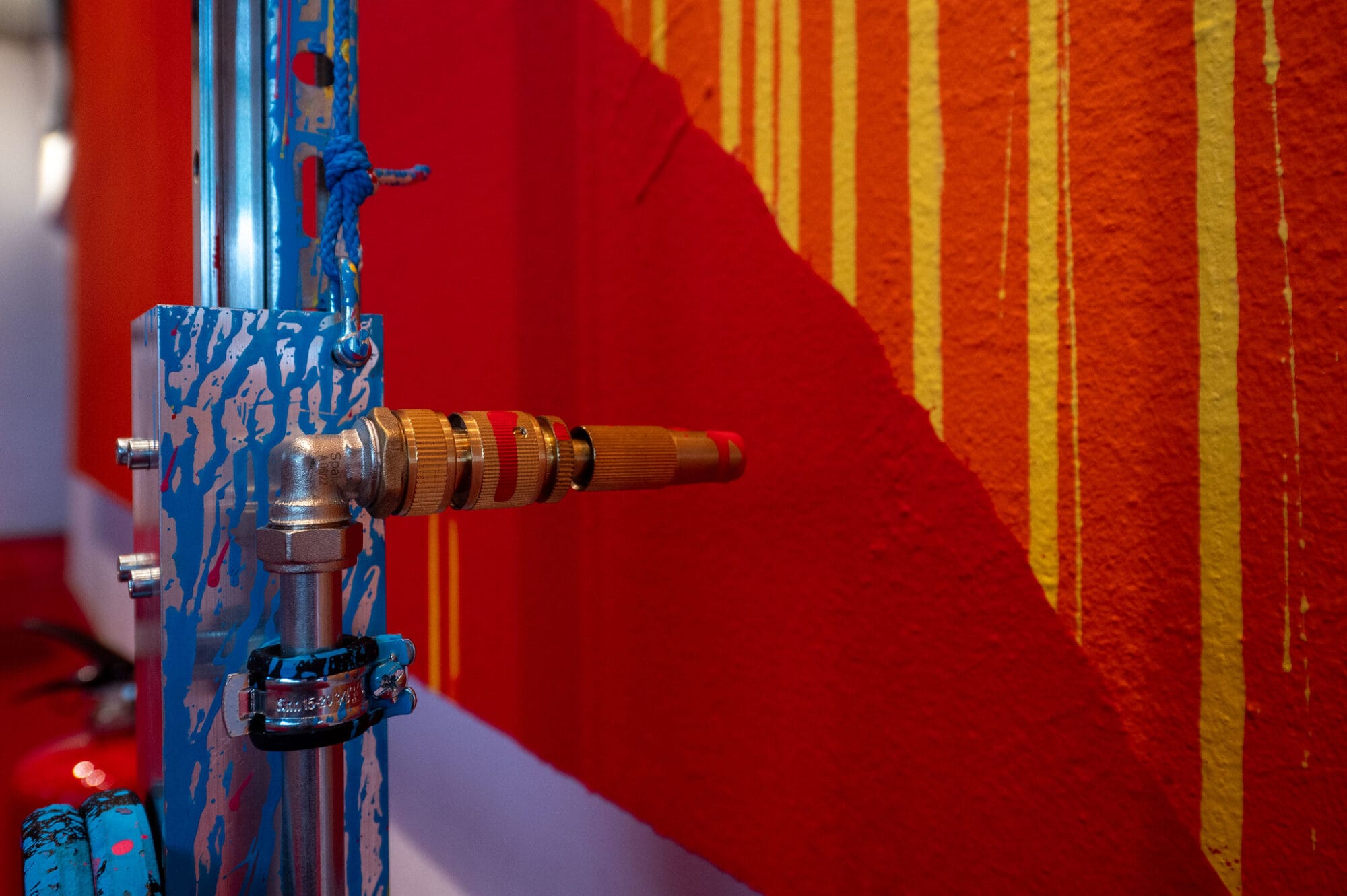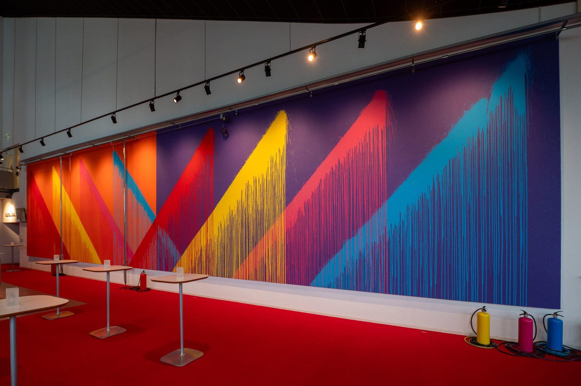 Tijdens Blind Walls Film Fest werkte Rutger de Vries live voor het aanwezige publiek aan deze muurschildering, gemaakt met zijn eigen machines, rig-systemen en straalpistolen waarmee hij verf gecontroleerd laat “vallen”, “spuiten” of “botsen”.