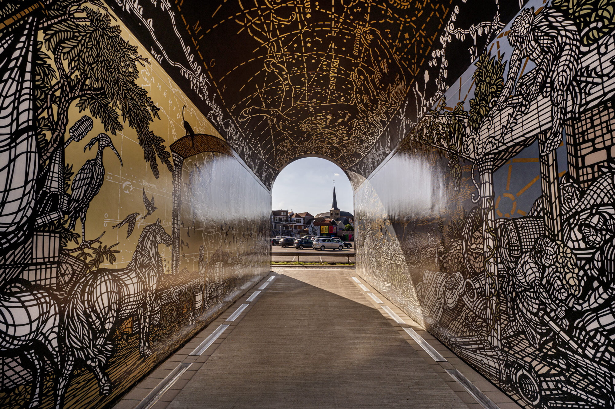 Het gebruik van koude en warme kleuren staat symbolisch voor dag en nacht. MonkeyBird Crew liet zich inspireren door het schilderij ‘De overgave van Breda’, gemaakt door kunstenaar Velasquez. De overeenkomst die twee volkeren sluiten staat voor openheid en overgang, iets dat in verband kan worden gebracht met de tunnel.