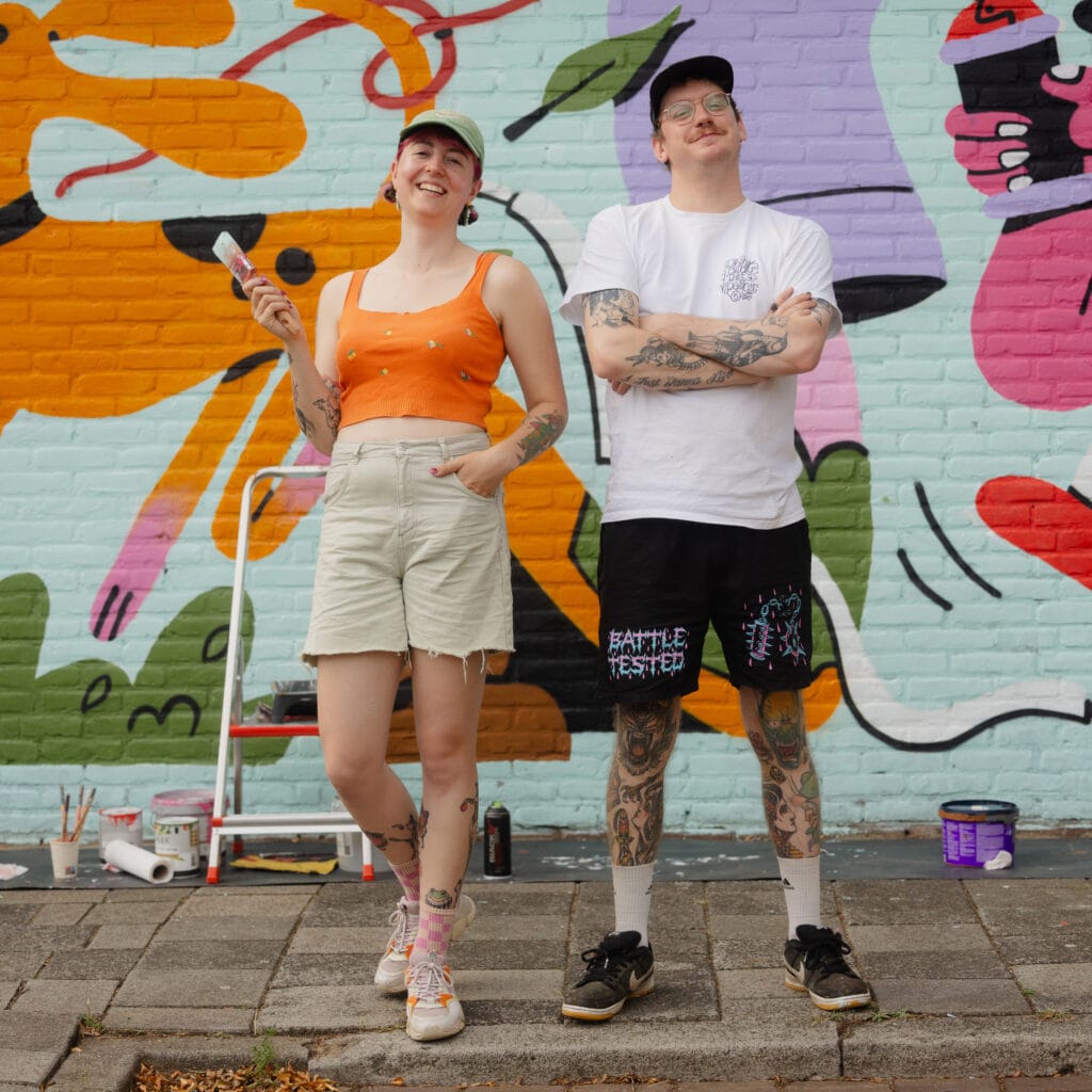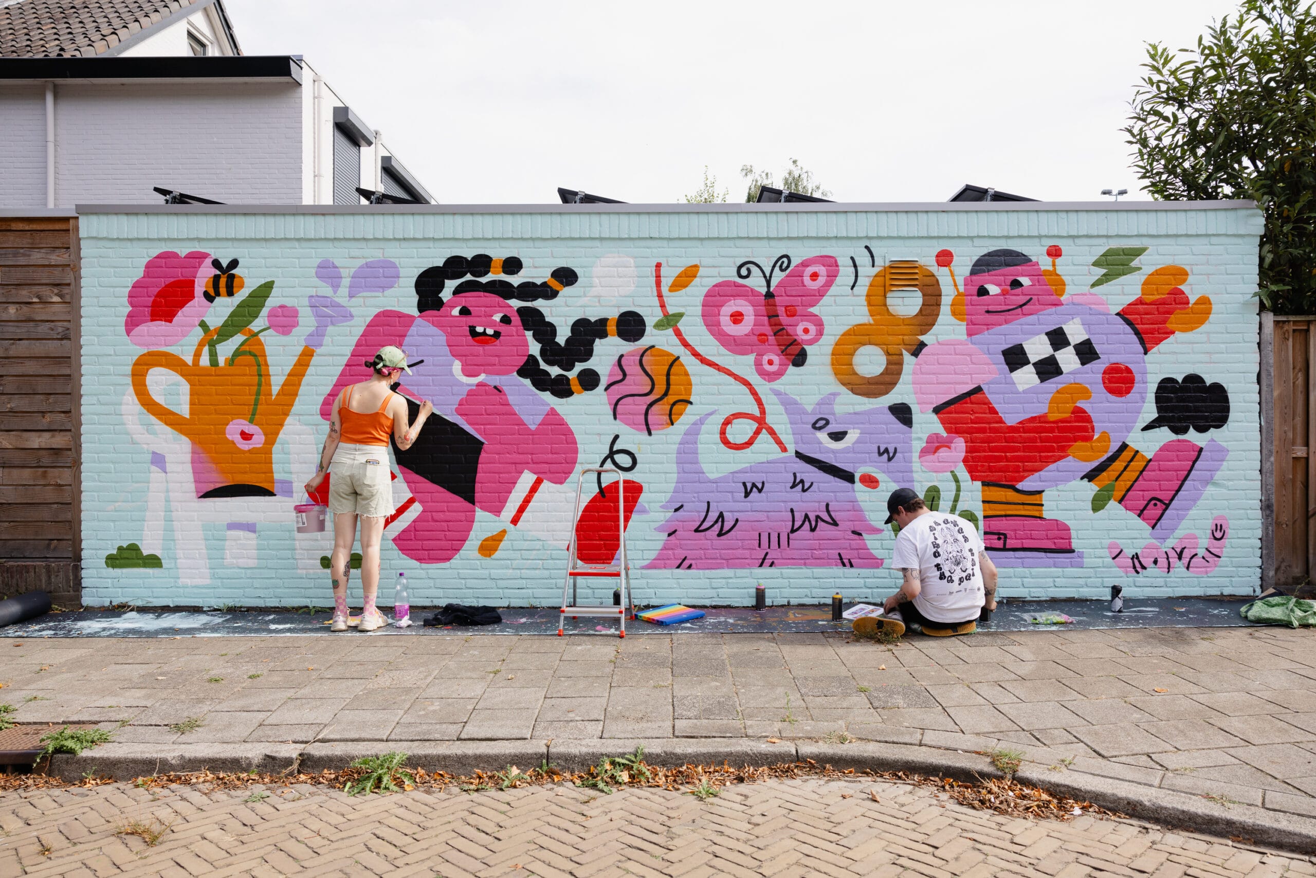 Op basis van al deze tekeningen ontstonden twee ontwerpen voor de kleurrijke muurschilderingen. Hierna was het tijd voor iedereen om mee te schilderen. Lokale kunstenaars, buurtbewoners en natuurlijk de kinderen hebben meegeholpen. Een schildering door, over en voor iedereen!