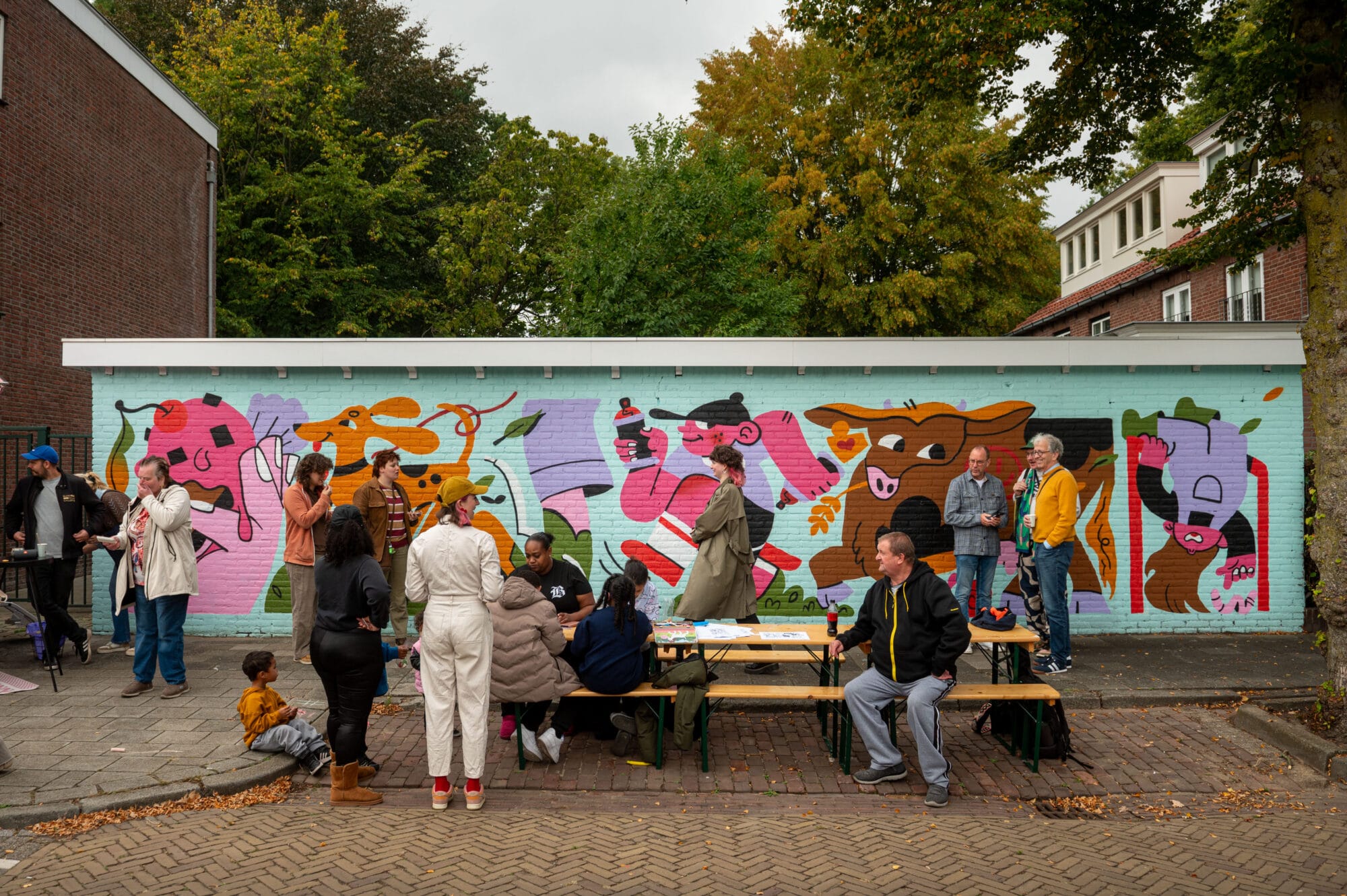 Op basis van al deze tekeningen ontstonden twee ontwerpen voor de kleurrijke muurschilderingen. Hierna was het tijd voor iedereen om mee te schilderen. Lokale kunstenaars, buurtbewoners en natuurlijk de kinderen hebben meegeholpen. Een schildering door, over en voor iedereen!